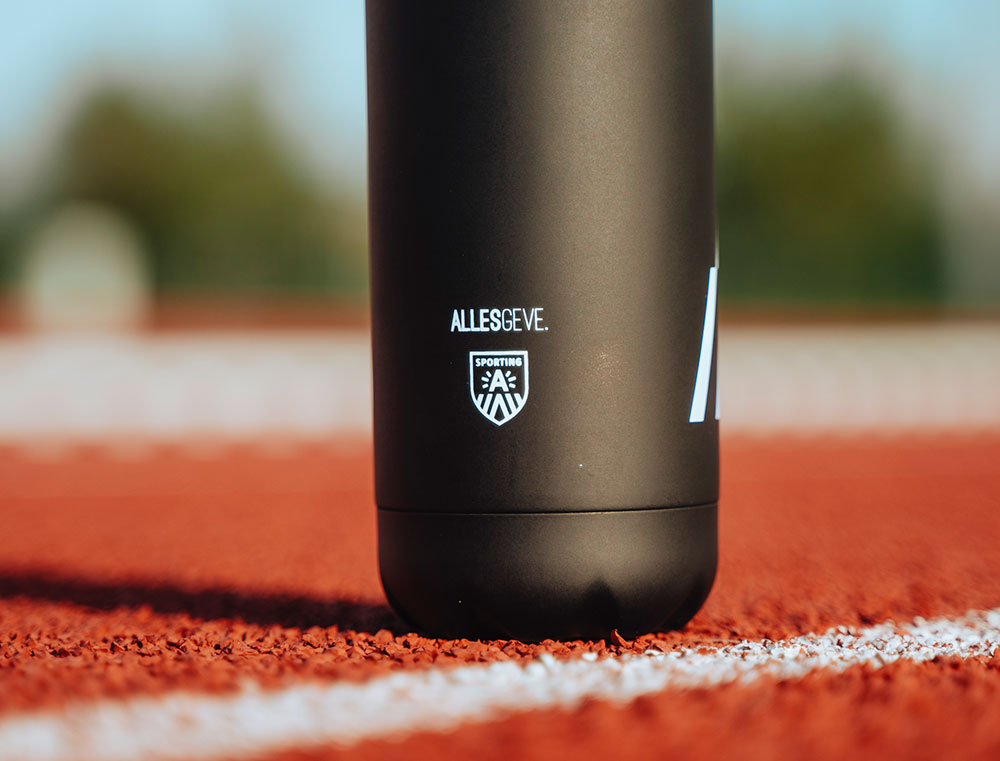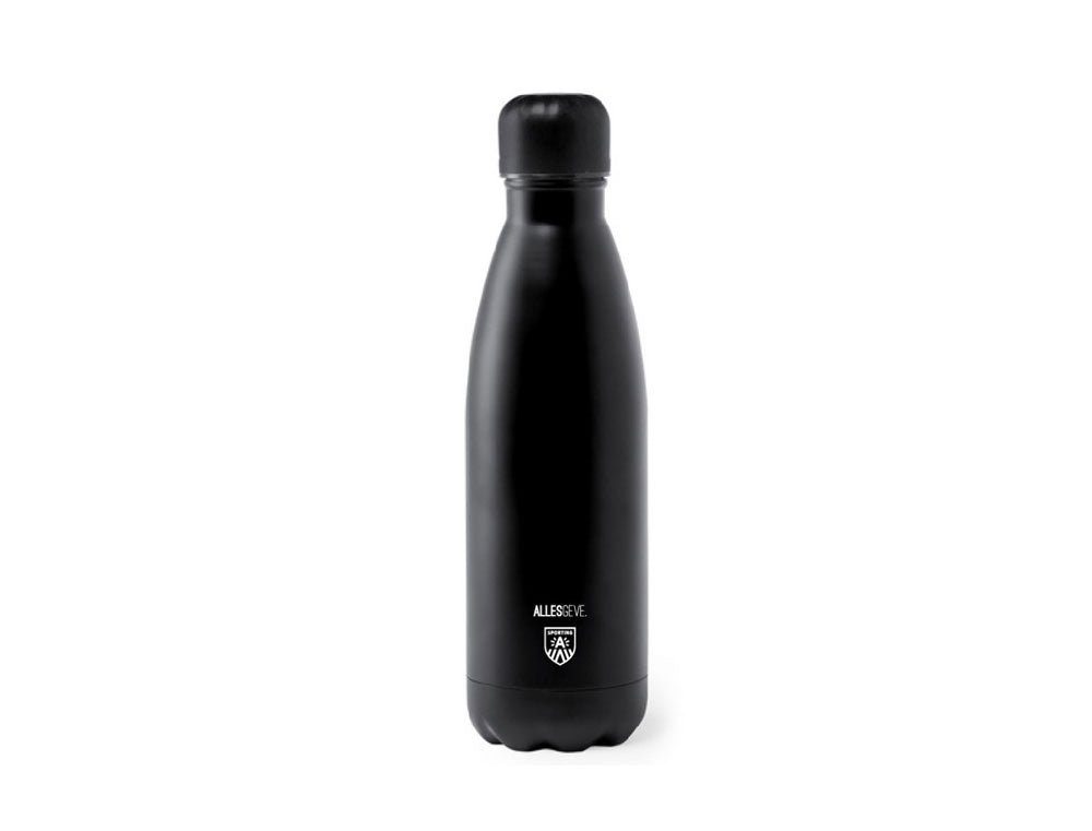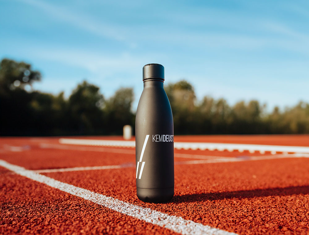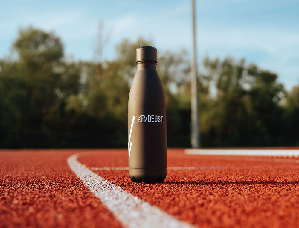 Stevige zwarte drinkfles met daarop de tekst KEMDEUST. Achteraan de bidon afgewerkt met de logo's van Sporting A en de tekst ALLESGEVE.