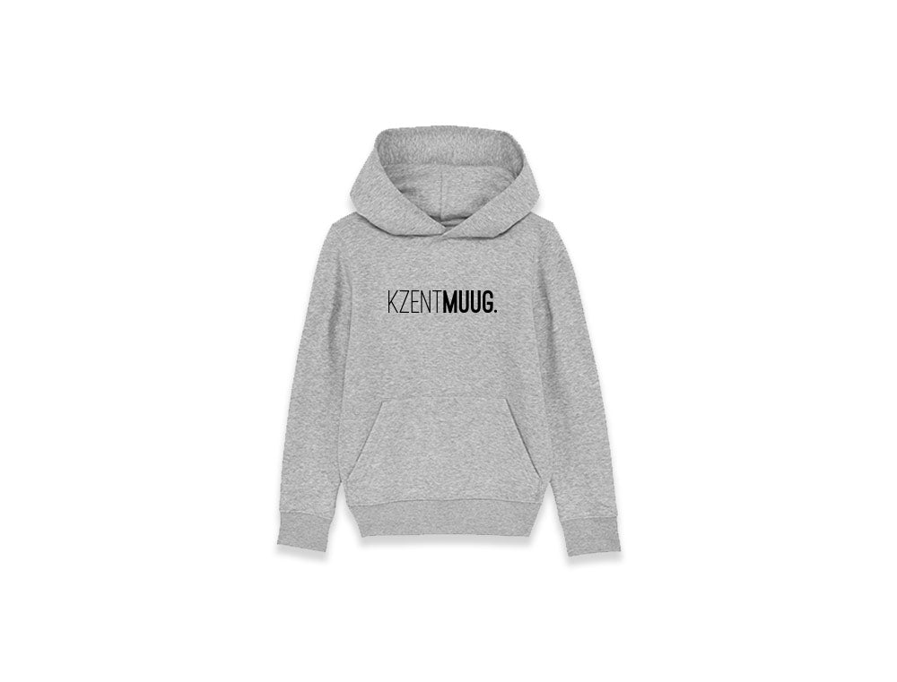 Grijze hoodie met opschrift KZENTMUUG. voor kinderen. Recht uit Antwerpen. Met trots voor het dialect. Als cadeau of gewoon voor je eigen kind.