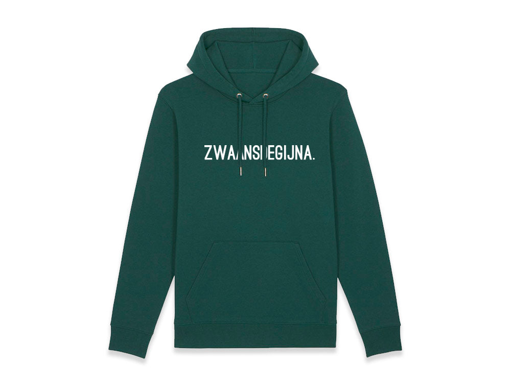 Groene hoodie met opschrift ZWAANSDEGIJNA. voor volwassenen. Als cadeau of gewoon voor jezelf. Recht uit Antwerpen. Met trots voor het dialect.