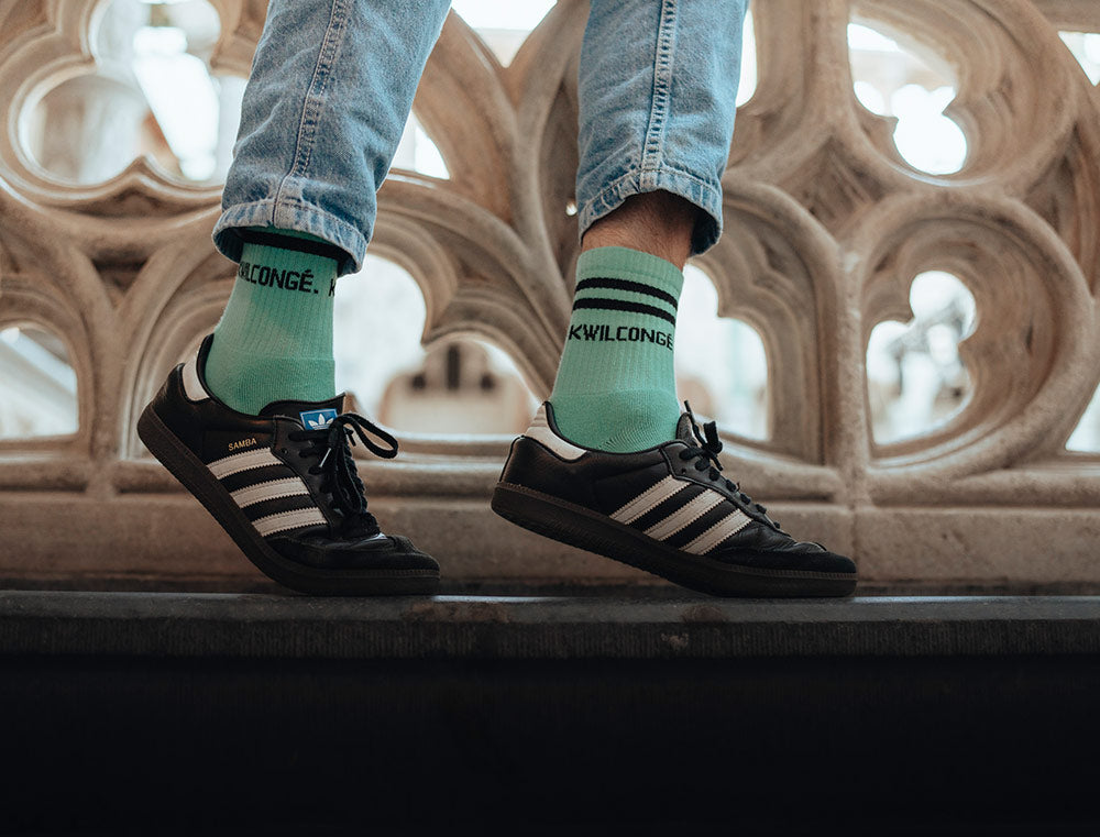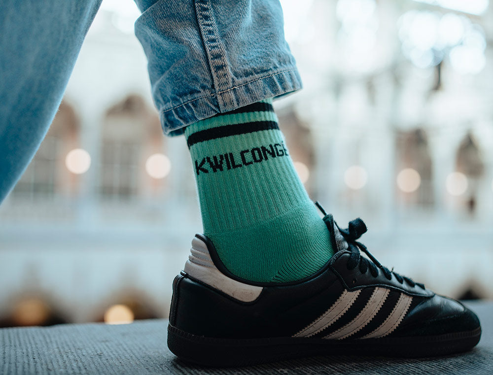 Comfortabele groene sokken met opschrift KWILCONGÉ. voor volwassenen. De kousen hebben een normale pasvorm met verdikking aan de zool voor extra comfort. Als cadeau of gewoon voor jezelf. Recht uit Antwerpen. Met trots voor het dialect.