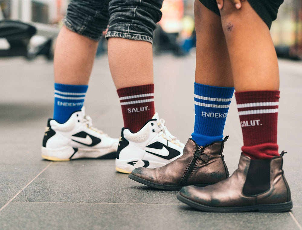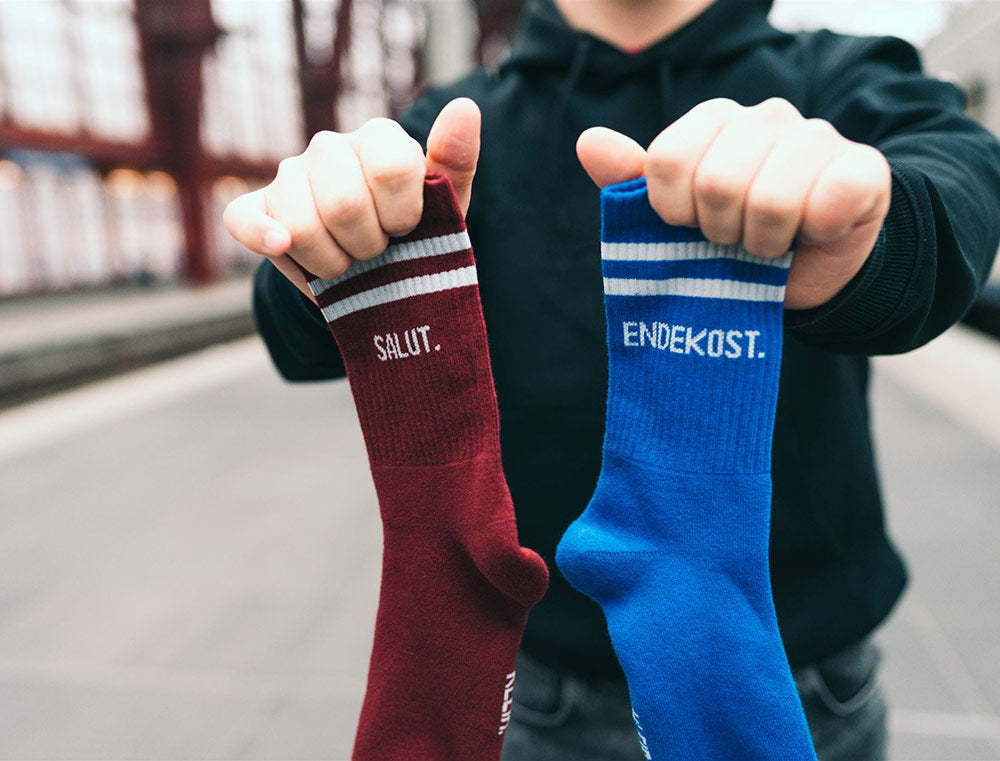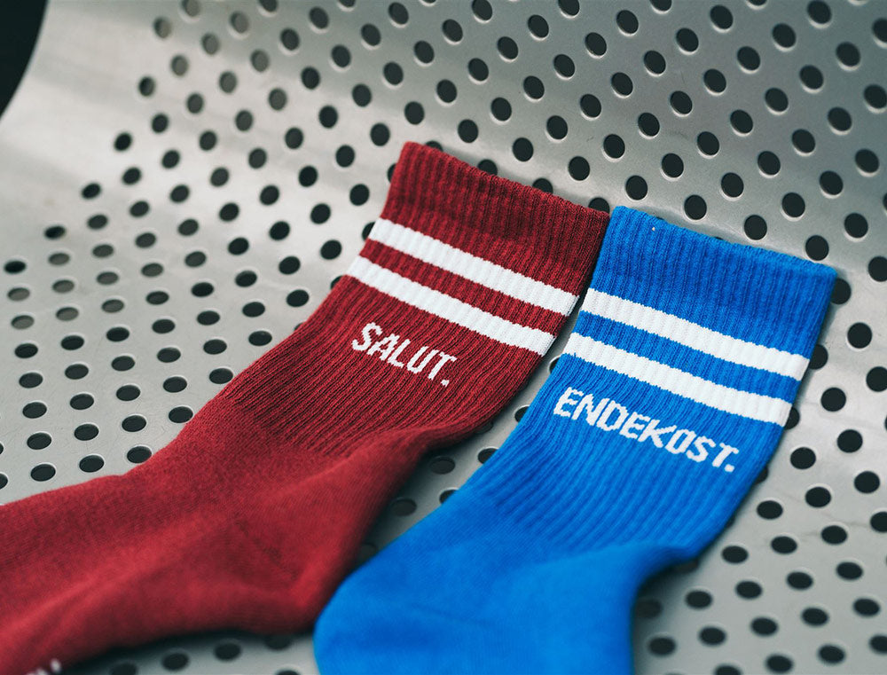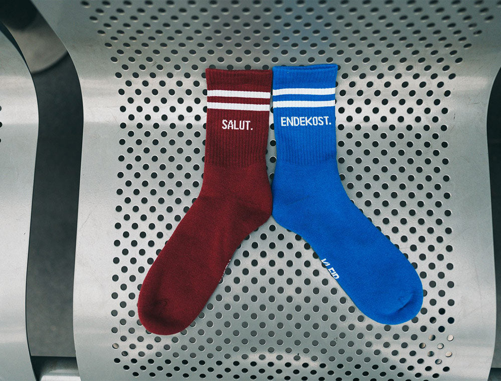Comfortabele rood-blauwe sokken met opschrift SALUT. ENDEKOST. voor volwassenen. De kousen zijn stevig, redelijk dik en hebben een normale pasvorm met een extra verdikking aan de zool voor extra comfort. Als cadeau of gewoon voor jezelf. Recht uit Antwerpen. Met trots voor het dialect.
