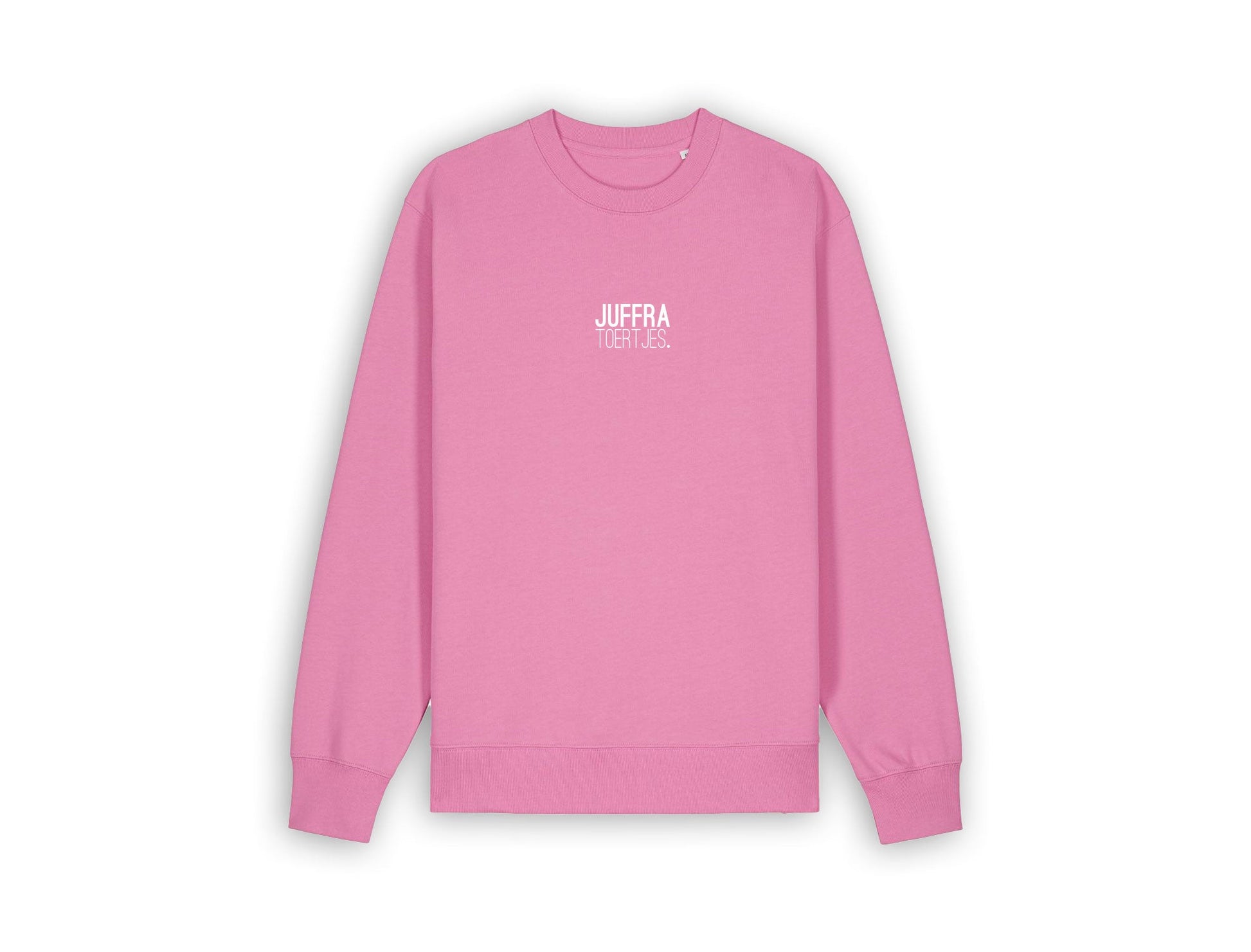 Roze sweater met opschrift JUFFRA TOERTJES. Als cadeau of gewoon voor jezelf. Recht uit Antwerpen. Met trots voor het dialect.
