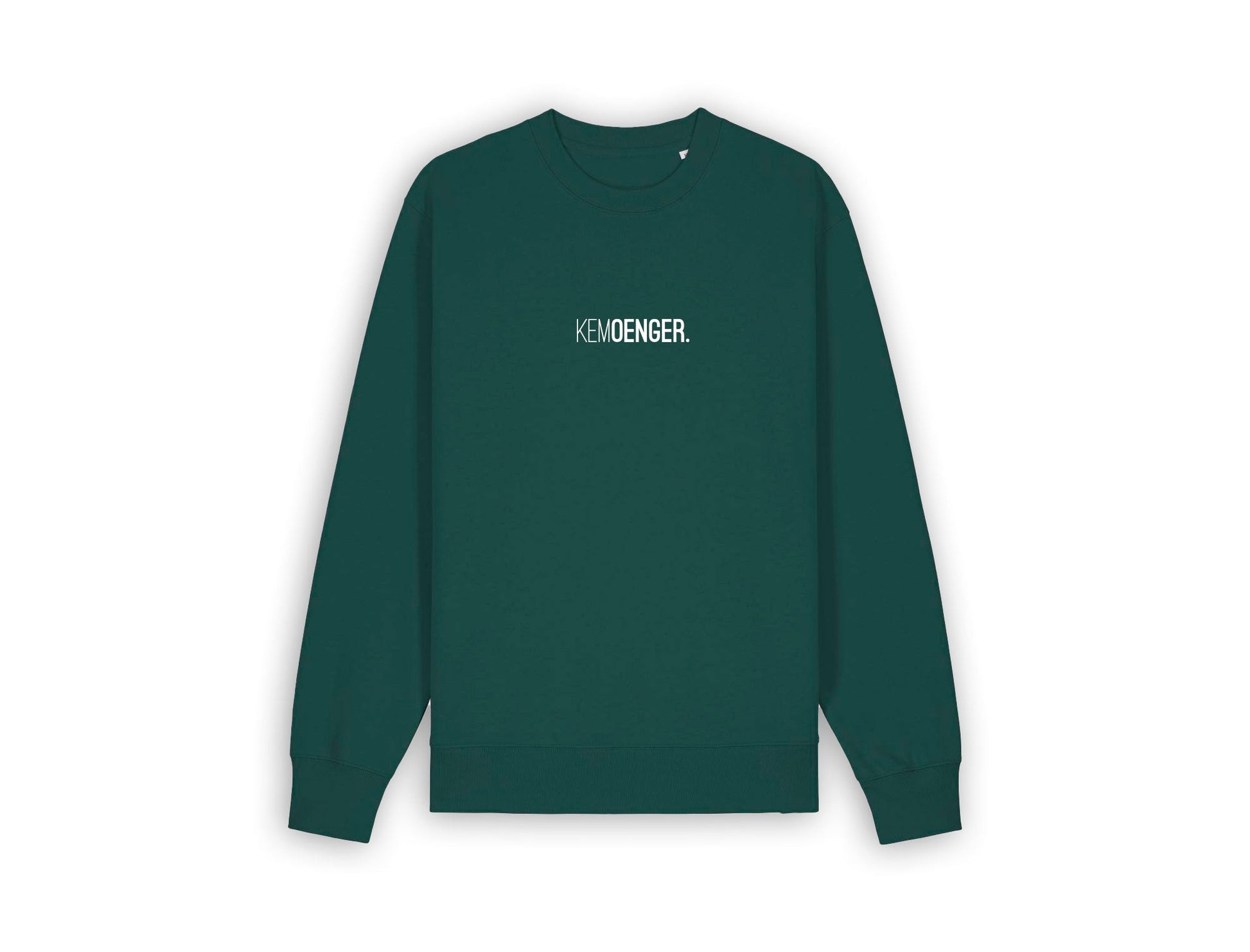 Groene sweater met opschrift KEMOENGER. voor volwassenen. Als cadeau of gewoon voor jezelf. Recht uit Antwerpen. Met trots voor het dialect.