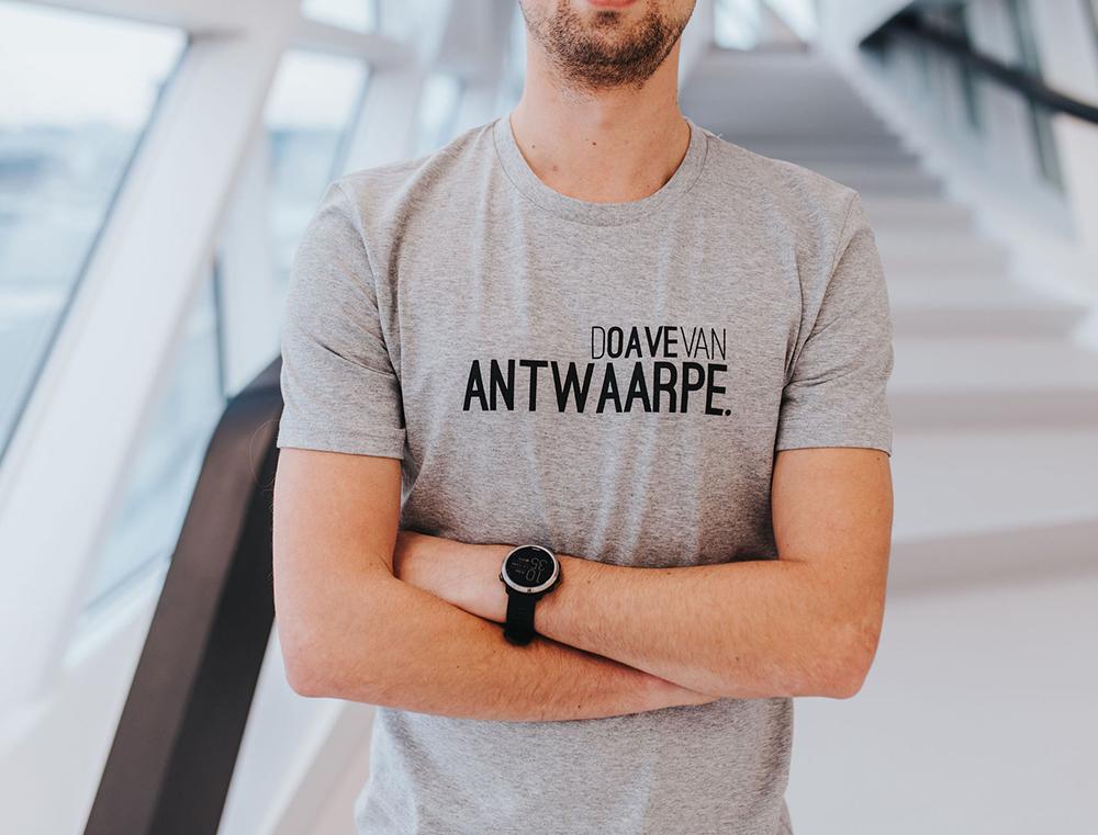 Grijze T-shirt met opschrift DOAVEVANANTWAARPE. voor mannen en vrouwen. Recht uit Antwerpen. Met trots voor het dialect. Als cadeau of gewoon voor jezelf. Deze T-shirt is afgewerkt met het logo van Port of Antwerp en KLEIR. in de nek langs de binnenkant.