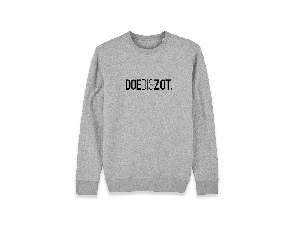 Grijze trui met opschrift DOEDISZOT. voor volwassenen. Als cadeau of gewoon voor jezelf. Recht uit Antwerpen. Met trots voor het dialect.