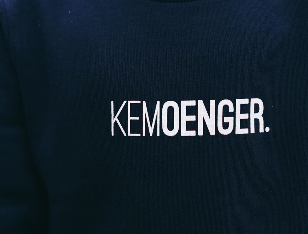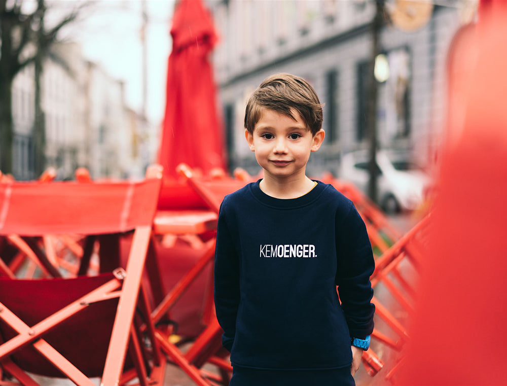 Blauwe trui met opschrift KEMOENGER. voor kinderen. Als cadeau of gewoon voor je eigen kind. Recht uit Antwerpen. Met trots voor het dialect.